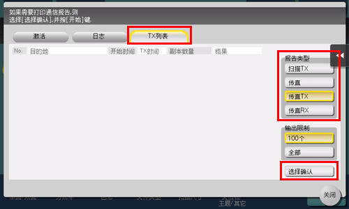 在[TX列表]选项的[报告类型]中指定报告类型,触摸[选择确认],然后按开始键。