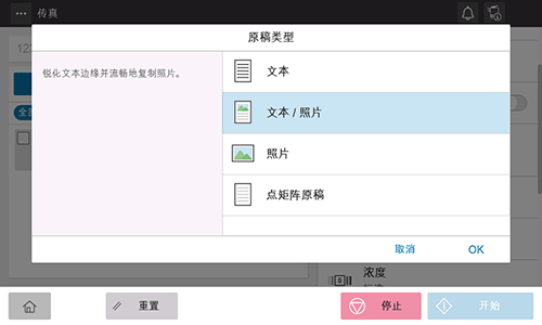 选择[原稿类型],然后选择匹配要发送原稿内容的图像质量。