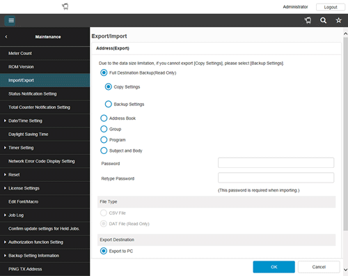 After export is executed with password entry, importing of the destinations to another MFP requires password entry.