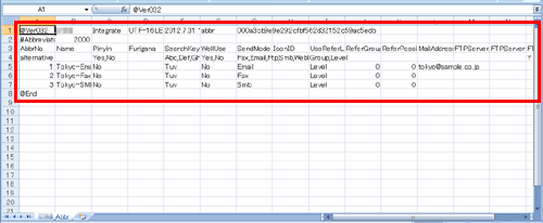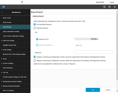 When importing [Address], if you select [Updates containing only Registration number, leave the original data of the address and Registration Number.], address information, in a file to be imported, containing only a registration number, is not registered in the machine. If you select [Updates containing only Registration number, delete the original data of the address and Registration Number.], address information containing only a registration number is deleted from the machine.