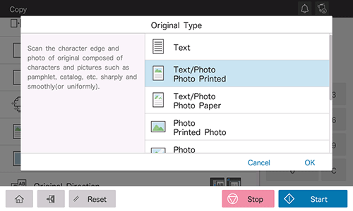 [Text/Photo - Printed Photo] | Copies the original, which consists of text and photos, at the optimum level of image quality. This function sharpens the edges of each character and reproduces smoother photos. Select this option to scan printed originals such as brochures and catalogs. |