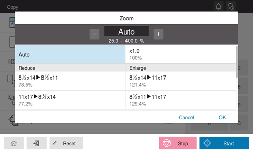 Fixed Zoom | Select a preset zoom ratio when copying a standard-size original onto standard-size paper. The paper tray is automatically exchanged depending on the selected zoom ratio. |