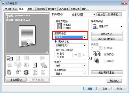 在[基本]选项上的[原稿尺寸]中选择[信封]或[明信片]。