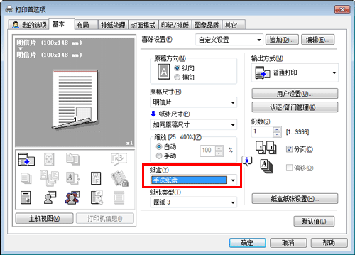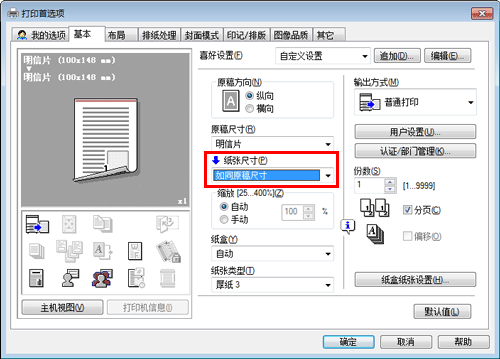 如果选择了[明信片],[纸张类型]会自动设为[厚纸 3]。如果选择了[信封],[纸张类型]会自动设为[信封]。