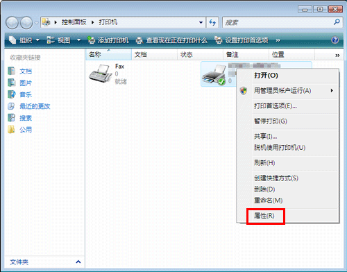 在Windows Server 2008中,右键单击所安装打印机的图标,然后单击[属性]。