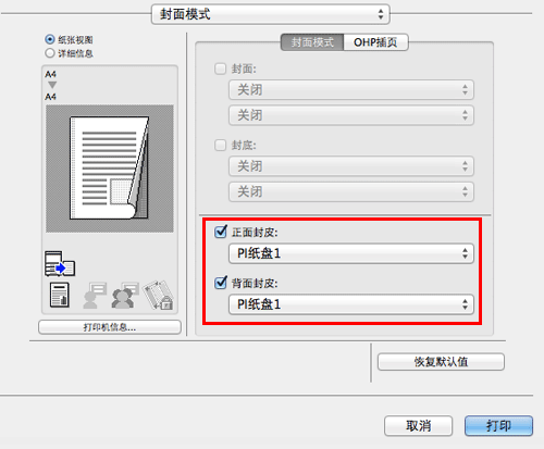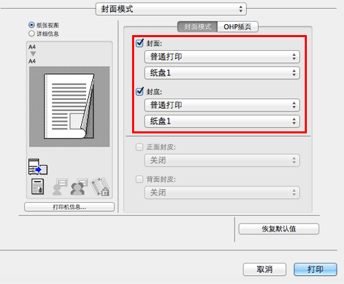 在[封面模式]中,选择[正面封皮:]和[背面封皮:]复选框。