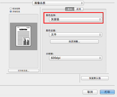 在[图像品质]的[颜色选择:]中,选择[灰度级]。