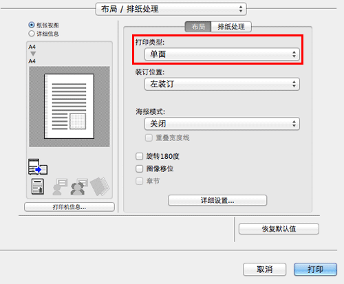 在[布局/排纸处理]的[打印类型:]中,选择[单面]。