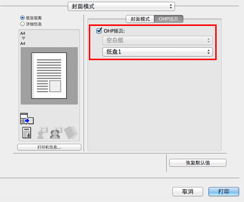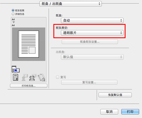 在[纸盒/出纸盘]的[纸张类型:]中,选择[OHP投影片]。