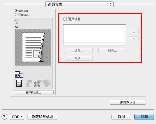 如果列表中没有注册任何内容,选择[逐页设置:]复选框将自动显示设置窗口。