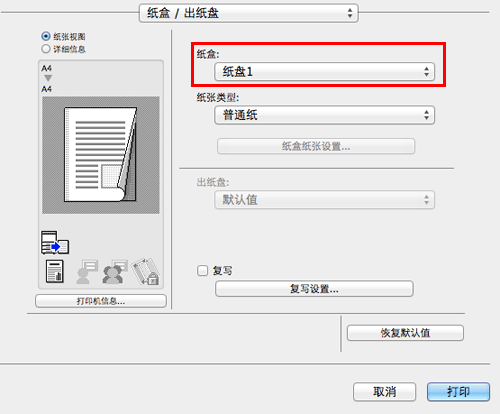 在[纸盒/出纸盘]的[纸盒:]中,选择用于打印正文页的纸盒。