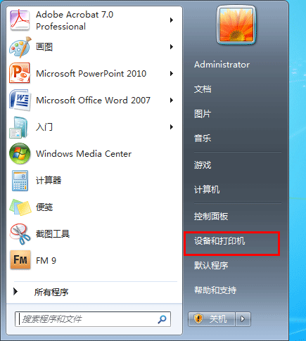 在Windows 7/Server 2008 R2中,单击开始菜单,然后单击[设备和打印机]。