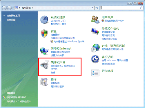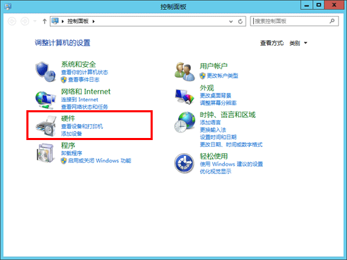 在Windows Server 2008中,单击开始菜单,然后单击[控制面板]-[硬件和声音]-[打印机]。