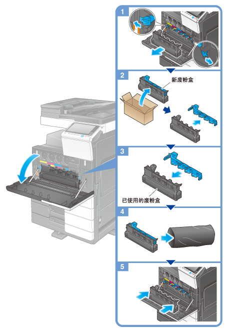 拆下废粉盒后,快速盖好。如果废粉盒倾斜,废粉可能会溢出。