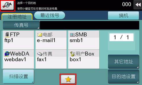 [扫描/传真] | 触摸此按钮显示扫描/传真模式下的主画面。 有关详细资料,请参见此处。 |