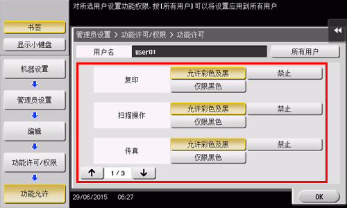 [复印] | 若要允许使用完全复印功能,选择[允许彩色及黑]。若要仅允许进行黑白复印,选择[仅限黑色]。若要禁止复印,选择[禁止]。 |