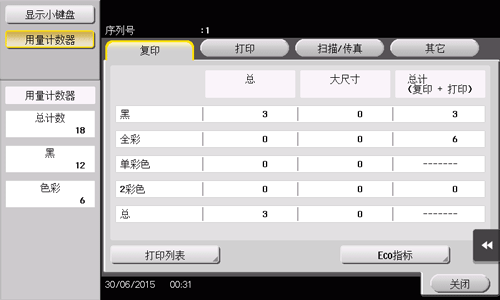 您可以通过选择[复印]、[打印机]、[扫描/传真]或[其他]来查看其它功能的输出数量。