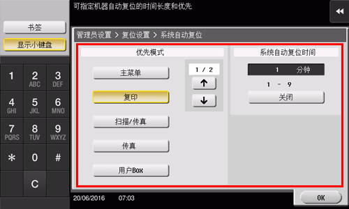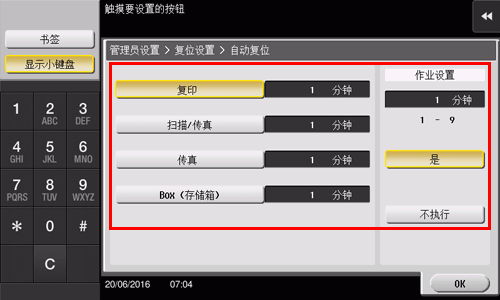 选择重置后显示的功能并使用数字键盘输入返回至默认设置的时间。