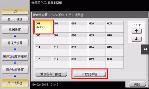 选择要查看其计数器的用户,然后触摸[计数器详细]。
