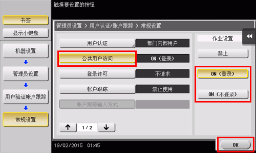 选择[公共用户访问],再选择[ON (登录)]或[ON (不登录)],然后触摸[OK]。