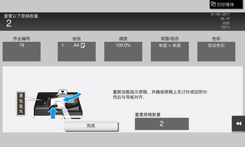 放回原稿或纸张,然后触摸[确定]或[完成];系统重新开始扫描或打印原稿。
