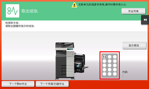 如果在本机上发生纸张或装订针卡住的情况,触摸屏会显示卡纸清除步骤和发生纸张或装订针卡住的部位。如果发生纸张或装订针卡住,查看触摸屏了解卡住清除步骤和发生卡住的位置,然后按照相关纠正措施的向导进行操作。