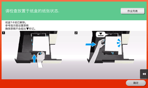 清除卡纸后,会显示指示如何正确装入纸张或原稿的画面。