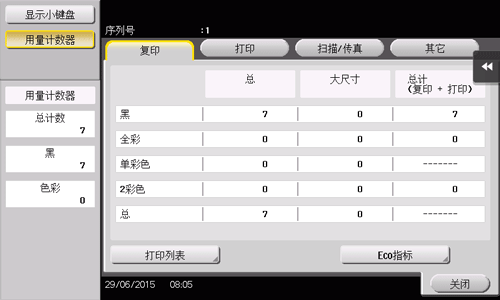 触摸[Eco指标]可以查看彩色打印作业和所有打印作业的比率、使用双面打印或页面合并功能的纸张节约比率,以及操作的累计时间或用户操作方法的节能量。