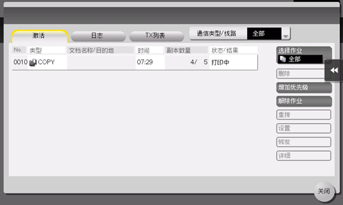 触摸[进程中]在本机上显示当前作业或预备作业。必要时,可以对打印作业重新排序或者删除预备作业。