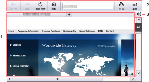 2 | 工具栏 | 触摸工具栏上的图标可移动和重新加载页面,或者显示和添加偏好页面。 如果将URL输入到地址输入字段,可以直接访问指定URL上的页面。 工具栏支持网络浏览器设置。 有关工具栏的详细资料,请参见此处。 |