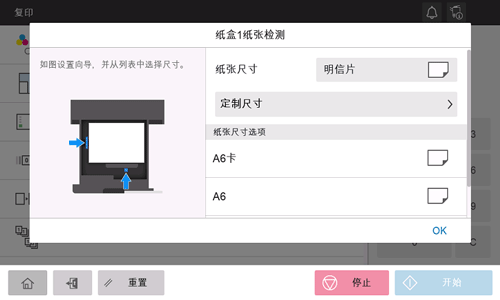 如有必要,请更改纸张设置屏幕上纸盒的纸张设置。