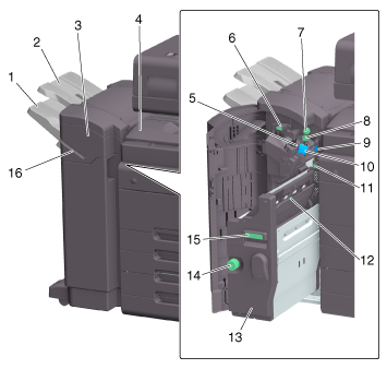 13 | 鞍式装订器 | 清除卡纸或卡住的订书钉,或者更换鞍式装订器时拉出该单元。 |