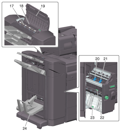 20 | 鞍式装订盒1 | 清除卡住的订书钉或更换鞍式装订器时从鞍式装订器中拉出该盒。 |