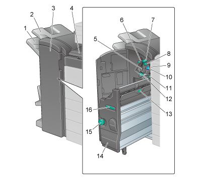14 | 鞍式装订器 | 清除卡纸或卡住的订书钉,或者更换鞍式装订器时拉出该单元。 |