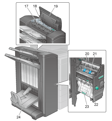 20 | 鞍式装订盒1 | 清除卡住的订书钉或更换鞍式装订器时从鞍式装订器中拉出该盒。 |